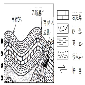 1.下列有关该处地质事件发生的先后顺序,最正确的是2.丙侵入岩脉应为何种岩石3.图中⑤处岩石发生了变质,形成的岩石最可能是