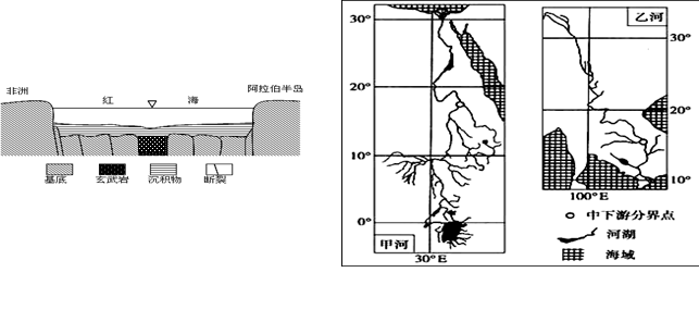 4、单选题 读“甲、乙两河流域分布示意图”及“红海剖面示意图”,回答下列小题。