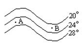 本题解析:根据图文资料判断,24°<A<28°,20°<B<24°,故AB错;7月份的中纬度由于海陆热力差异影响,海洋的温度比陆地低,故D正确。