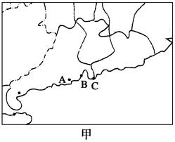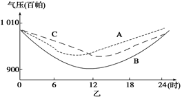3、综合题  某灾害性天气系统从珠江口附近过境,如图甲所示:A、B、C三地观测到过境时的气压与平均风速随时间的变化规律示意图分别如图乙、图丙所示。回答下列问题。(12分)