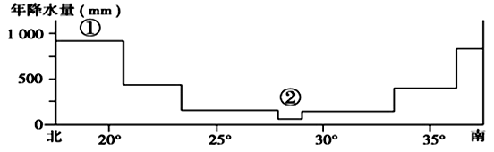 【小题1】该图,根据图中纬度和方向,可以判断是南半球。位于某大陆东岸,沿140°经线年降水量分布图,所以此经线为140°E。结合②地纬度可知,②地位于澳大利亚大陆内部,是热带沙漠气候,主要受副热带高压带和信风带控制,所以降水稀少,B对。