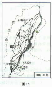 1、综合题 (12分)银川平原位于宁夏北部,自秦汉以来,历代凿渠引水,发展灌溉农业,素有“塞上江南”、“西部粮仓”的美誉。读图15,回答下列问题。