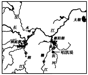 3、综合题  ? 2010年6月21日江西抚河唱凯堤决口,造成该年度南方最严重的洪水灾害。经军民六昼夜奋战,6月27日溃口被堵住,之后当地政府组织广大农民及科技人员在淹没后的广阔土地上抢种晚稻,获得了历史上最大丰收,这是自然帮忙、人努力的结果。结合材料及抚河唱凯堤位置示意图,回答下列问题。