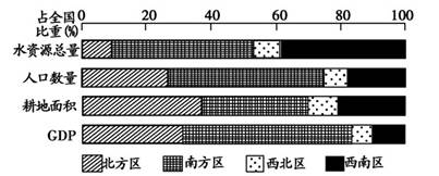 4、单选题 下图为“2006年我国水资源、人口、耕地和经济总量区域比重图”。读图完成下题。