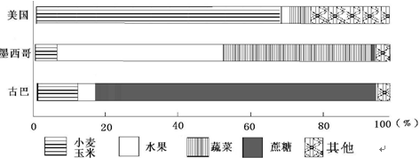 材料二:2008年美国、墨西哥和古巴主要农产品构成。