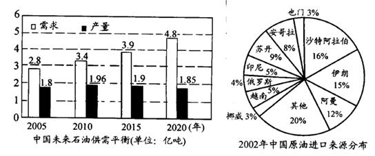 (1)由左图中需求量和产量可以得到进口量,进口量越大,对外依赖程度越大。结合图中数据,在2105年,需求量为3.9亿吨,产量为1.9亿吨,进口量为2.0亿吨,超过50%。由右图中我国石油进口来源可以判断,主要来自中东。