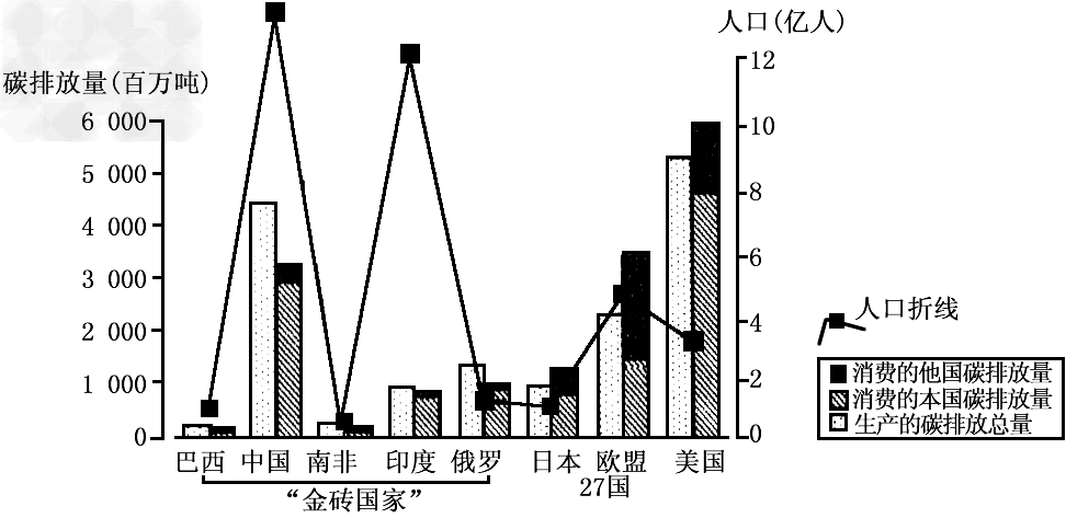 4、单选题 读世界部分国家生产和消费碳排放柱状图及人口数量折线图,回答1-2题。
