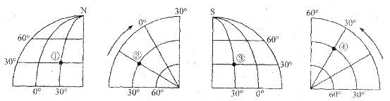 1.图中①~④点的坐标既位于南半球,又位于西半球的是2.图中四点坐标位置相同的一组是3.对于图中四点的相互关系的叙述,正确的是