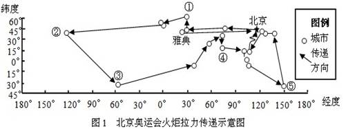 1、单选题  北京奥运会火炬将于2008年3月25日在雅典采集火种,4月1日从北京出发在全球传递,5月传回国内。读图1,完成下列问题。