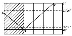 1、单选题 该图中的MP、MQ为部分晨昏线。阴影所在的经度范围与全球其他地区日期不同,读图回答问题。