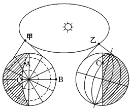 2、综合题 读地球在公转轨道上甲、乙两处的昼夜分布放大图,回答下列问题。