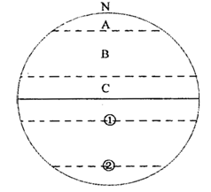(1)图示A表示北极圈到北极点的范围为北寒带。B表示北回归线到北极圈的范围为北温带。