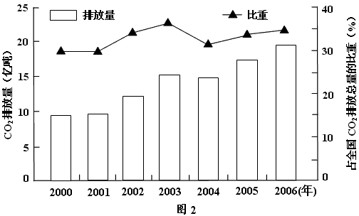 (3)2000~2006年,中国生产出口商品的CO2排放量约占全国排放总量的_____分之一(填整数),该时