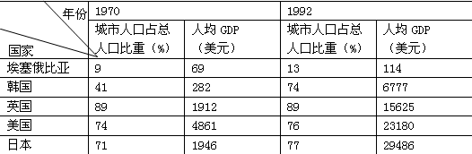 1.从表中数据看出,1970-1992年期间城市化速度最快的国家是2.据城市化发展的一般规律,埃塞俄比亚城市化水平低下的社会经济原因分析不妥当的是