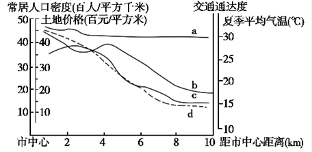 3、单选题 下图为我国某特大城市人口密度、土地价格、交通通达度、夏季平均气温变化图。读图完成下题。