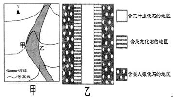 5、单选题 图中甲、乙是相同比例尺的同一地区等高线地形图和地质分布图。读图回答下面问题。