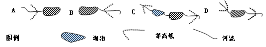 河流穿过等高线,河流流向与等高线凸向相反,咸水湖应为内流湖,故只有流入的河流,而没有流出的河流,故A图湖泊流向河流,为外流湖;B图河流流入湖泊,为内流湖,为咸水湖,正确;CD图示既有河流流入,也有河流流出为外流湖。