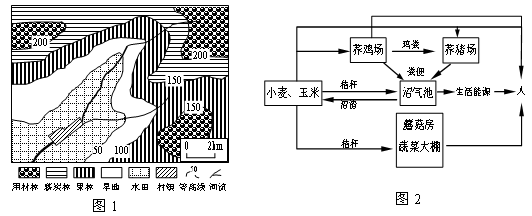 1、综合题 图1为“我国华北某地土地利用类型分布示意图”(等高线单位:m)。图2为该地区“生态农业园区结构示意图”。读图完成下列问题。(11分)