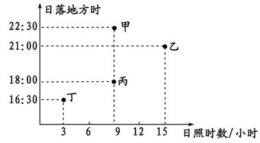 2、单选题 下图表示不同地点6月22日的日落时刻与日照时数(阳光实际照射地面时数)之间的关系。读图,完成小题。