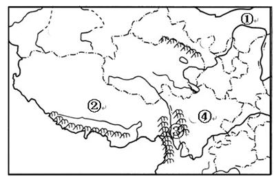 1.图中①处发展农业生产的有利因素主要是2.图中②④所在地区纬度大致相同,但地理环境差异显著,造成这一差异的主要因素是3.由图中提供的信息,可以推断②所在的省区,开发潜力巨大的能源有4.图中③所在林区比东北林区树种更为丰富,其根本原因是该地