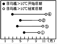 【小题1】日均温〉10℃的持续日期反映出热量的差异,若仅考虑纬度因素的影响,则纬度越低,热量越丰富,10°C以上的积温持续时间越长。