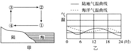5、单选题 影视剧中往往让女主角面朝大海,海风吹拂下让头发向后飘逸,以反映女主角的快乐心情。结合“北半球某滨海地区海陆环流图”(甲图)和“气温变化特征图”(乙图),回答1~2题。