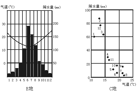 (1)根据A、B两地的气温降水资料(图、表),判断A、B两地的气候类型。