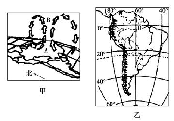 (1)材料一甲图箭头代表空气的上升与下降,A处和B处比较,气压较高的是________。图示环流状况下形成的降水类型叫做________雨。(4分)