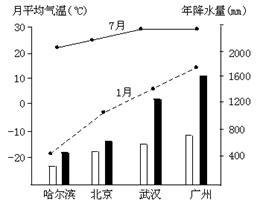 2、综合题 读“我国四个城市1月、7月平均气温和降水量图”(柱状图分别表示夏季降水和全年降水),回答:
