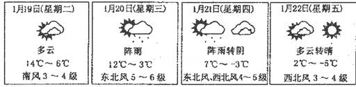 4、单选题 下图是由中央气象局发布的某城市2010年1月19日- 22日的天气预报。读图回答下列各题。