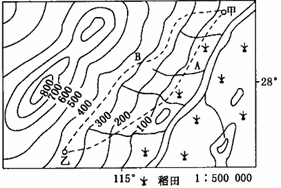 1.图中主要河流的流向为2.若在甲、乙两城镇之间修建一条公路,有A线和B线两个方案,B线方案与A线方案相比,主要的有利条件是3.图示区域的开发,有以下四种方案,最合理的是