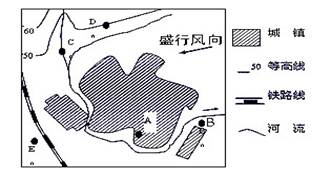 2、综合题 下图是某城市的布局状况,该城市要新建火力发电厂、自来水厂、印染厂和服装厂各一个,请在图中A、B、C、D、E五个地点选择,并说明理由。(8分)