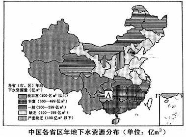 3.地下水丰歉程度除与气候因素有关外,还与地形地貌密切相关。上图中字母A代表的省级行政区简称是?,该省区与周围邻省相比,地下水资源较少,原因与该省区广布?地貌有关,这种地貌所在地区的岩石为可溶性岩石,渗水性很强,地下水易渗漏。