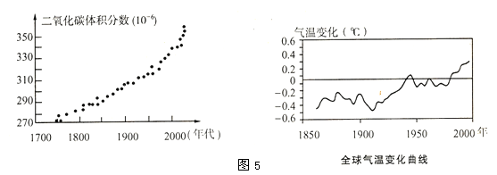 4、综合题 图5为“全球二氧化碳体积分数变化和全球气温变化曲线图”,回答问题:(10分)