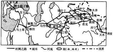 2、综合题 材料一:“丝绸之路”是横跨亚欧大陆、举世闻名的国际商品贸易和文化交流之路,2000多年来为人类文明的共同繁荣做出了巨大贡献。目前“丝绸之路”联合申遗项目已进入实施阶段,中国有48处文物点被列入申遗名单。