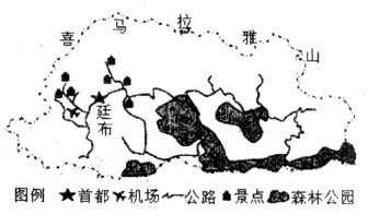 不丹(见下图)是位于中国和印度之间喜马拉雅山脉东段南坡的内陆国。有“森林之国”、“花卉之国”的别称。不丹人多信奉藏传佛教,随处可见挂在松枝上的五彩经幡。旅游业是不丹主要经济支柱之一,虽然不丹经济相对落后,但在2006年“快乐国度排行榜”中位列全球第八,亚洲第一。