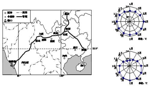 材料二:左图为中缅油气管道分布示意图。右上图为皎漂港各月均温统计图。右下图为昆明各月均温统计图。