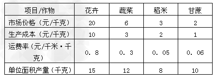 3、单选题 某平原地区,可种植花卉、蔬菜、稻米、甘蔗等四种农产品,地价相同,其产品全部提供同一市场出售。根据这四种农产品产销资料,完成1~2题。