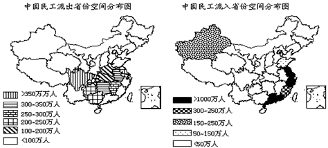 2、单选题 ? 据国家农调总队的抽样调查,我国每3个产业工人中就有2个来自农村,2003年我国外出务工的农民达1.14亿。读图完成1—2题。