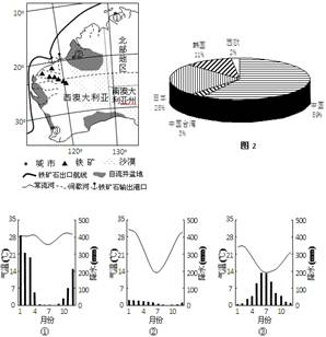 5、综合题  (8分)澳大利亚是世界上主要的铁矿石生产国和出口国。图1为澳大利亚部分区域示意图,图2为该国铁矿石出口国家和地区的构成图,图3为图1中①—③三地的气候统计图。完成下列问题。