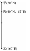 小题3:根据“地球公转速度较大”地球位于近日点附近,为冬半年,20°W地方时为12:00,则丙地16:48日落,40°N的北京的昼长约为9.5小时。所以本题选择A选项。