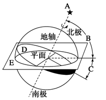 (4)当太阳光从E侧直射地球时,黄赤两平面交线与太阳光线的关系是?,此时直射?半球。(2分)