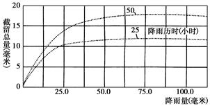 1、单选题 降雨被植物茎叶拦截的现象叫植物截留,其主要影响因素是植物疏密程度、植物种类、季节以及降雨特性。下图示意植物截留与降雨量、降雨历时关系。据此回答小题。