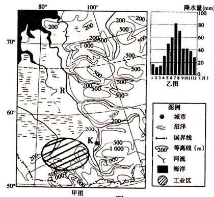 材料一 下面两幅图分别示意某区域水系分布及该区域K 地降水量月份分配。