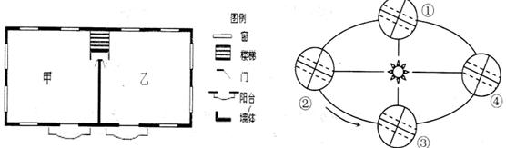 3、综合题 下面左图是某房地产公司在抚顺市开发的一梯两户式商品房平面图,右图为地球公转示意图,分析回答下列问题。(8分)