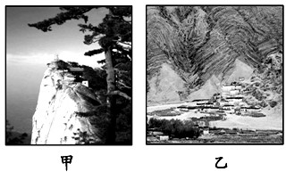 小题1:甲图为著名的华山景观,是地壳沿断裂面上升形成的。