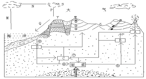 小题3:图中⑤--⑧代表岩石圈物质循环过程,⑦表示______________________________作用;⑧表示________________________________作用。