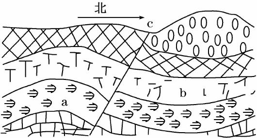 (2)地壳运动状况是:先发生褶皱,后发生断层。外力作用状况是:a、b两处表面出现差异侵蚀,背斜受侵蚀严重,出现岩层的缺失,形成相对低洼地,而向斜侵蚀相对较轻,形成相对高地。