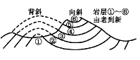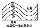 (3)利用向斜、背斜确定钻矿位置:背斜顶部易被侵蚀,背斜岩层中的矿石很可能被搬运走了,因此岩层中若含有某种矿产如煤、铁矿等,往往保留在向斜部分的地下,钻矿或打井应在向斜构造处。