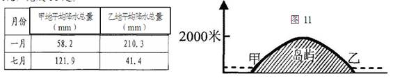 1、单选题 图11是某岛屿沿东西方向地形剖面示意图。表格是岛屿甲、乙两地1月和7月平均降水状况,完成33题。 ?